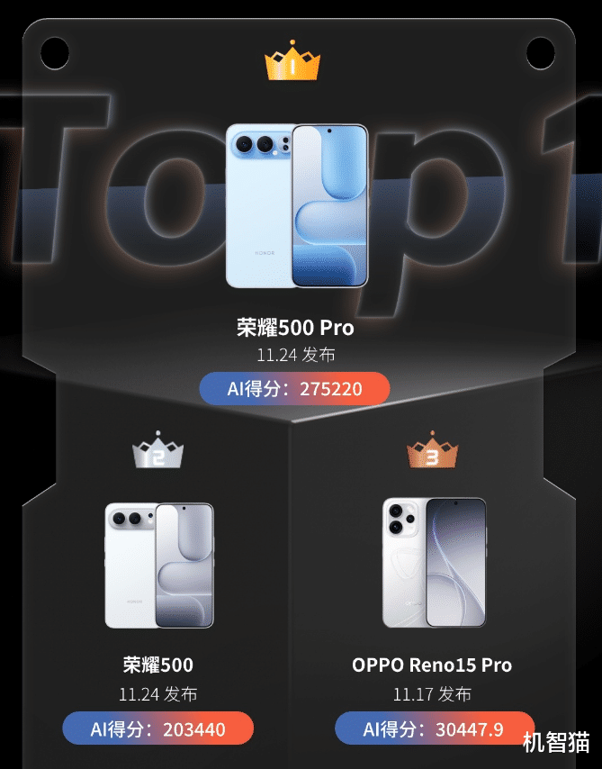 而在最近讨论较多的AI也有榜单,荣耀500 Pro位列第一,荣耀500和OPPO Reno15 Pro位居第二和第三。