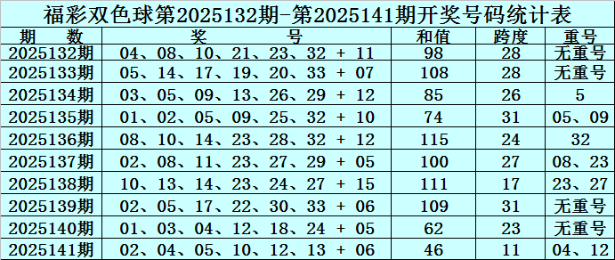 双色球第2025141期奖号开出:02、04、05、10、12、13 + 06,红球号码和值开出46,跨度开出11,开出重号2个:04、12。蓝球为0路号码。