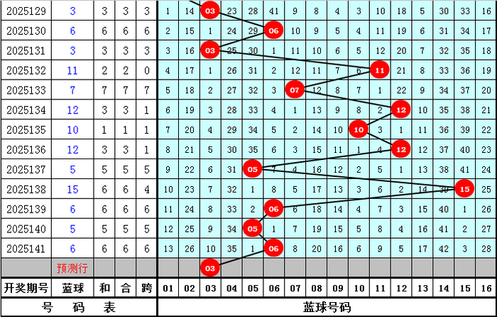 蓝球分析:上期开出蓝球号码06,号码遗漏值为2,温冷蓝球近期开出比例较高,本期防冷码蓝球继续解冻,参考蓝球号码03。